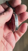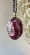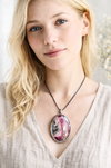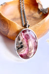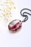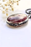 A beautiful cobalto calcite with stunning ribbon-like inclusions is set in a decorative bezel which features blooming sakura twigs.