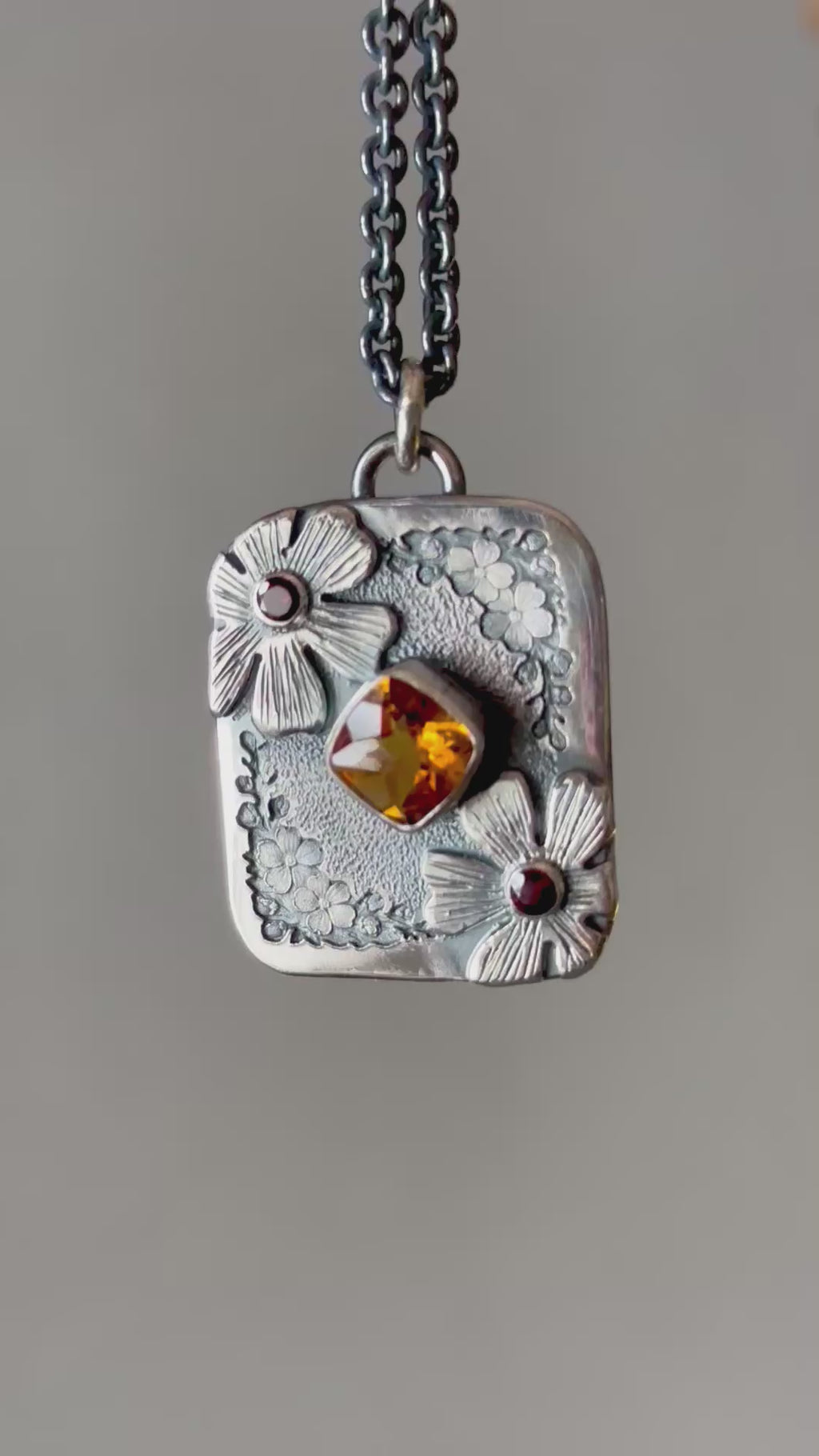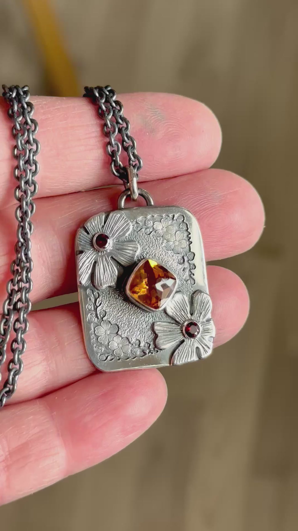 Warm as sunlight spilling through autumn leaves, this Forest Light Keepsake pendant features a glowing golden citrine centerpiece, accented by deep red garnet stones like tiny forest embers.