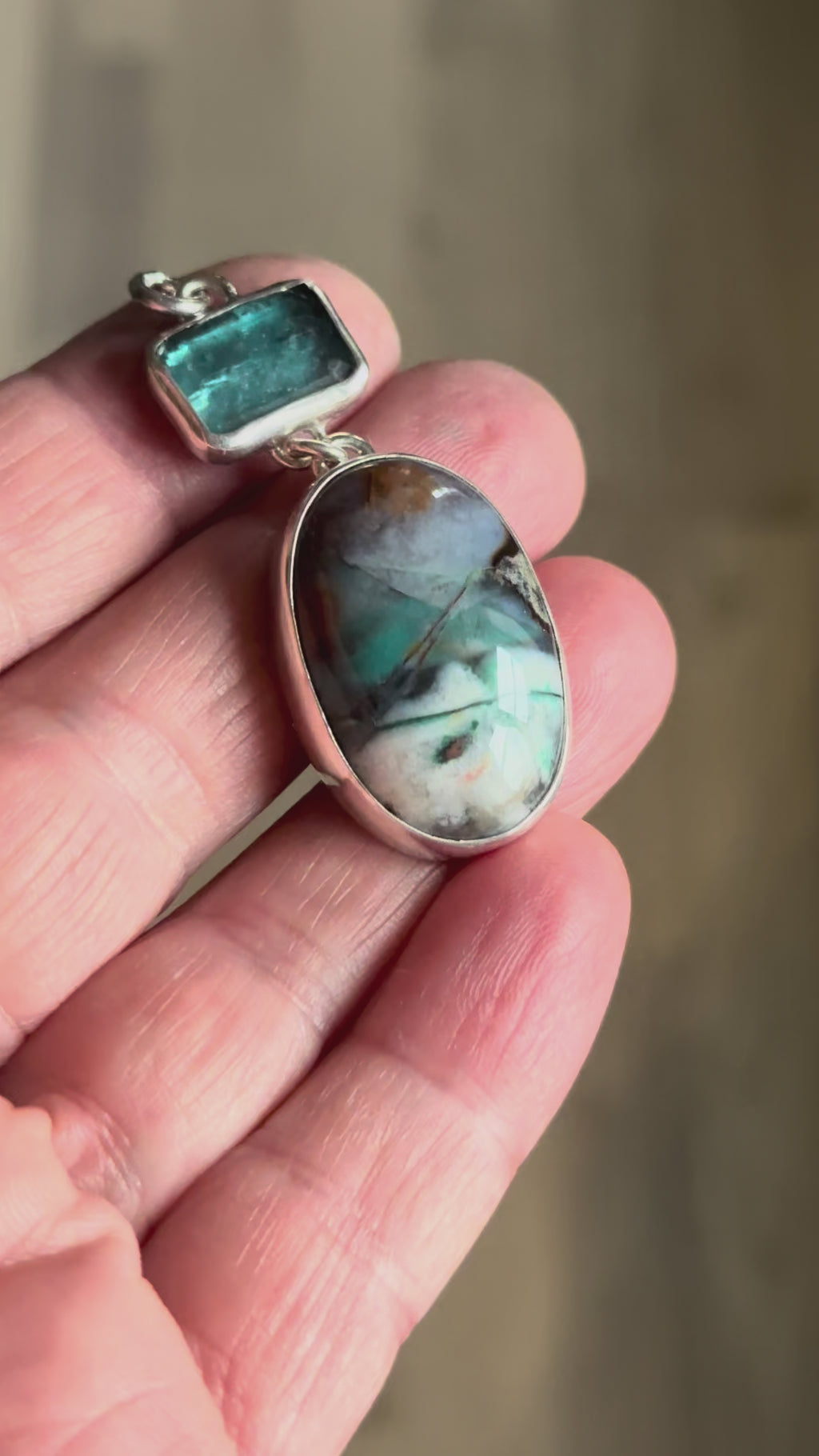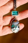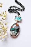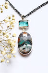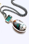 This one of a kind necklace features a beautiful opalized wood from Indonesian which is paired with a teal colored kyanite in a sterling silver design. The stones are joined together by a soldered split ring.
