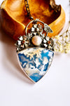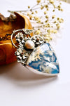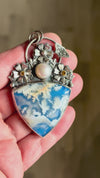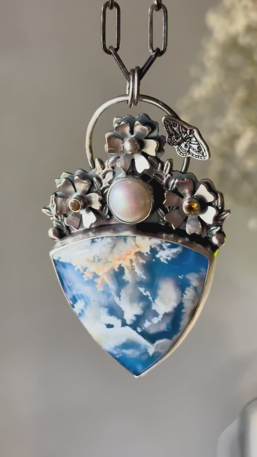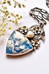 This one-of-a-kind handmade necklace showcases a breathtaking plume agate gemstone, whose dreamy white inclusions drift across a deep blue background like clouds across an open sky. Each plume agate is naturally unique, making this pendant a true wearable piece of nature’s art.