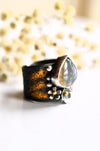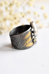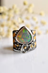 This sterling silver opal ring is all about texture, contrast, and quiet little details. A fiery Ethiopian opal sits at the center, flashing greens, oranges, and reds that shift with every movement of your hand. I set it on a wide, oxidized silver band to give it depth, then brushed streaks of gold across the surface so the light catches in unexpected places.