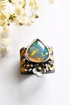Around the stone, small hand-formed silver flowers bloom, each one finished with a tiny gold center. The mix of darkened silver and warm gold gives the ring a worn-in, earthy feel while letting the multicolored opal stay the true focal point.