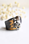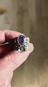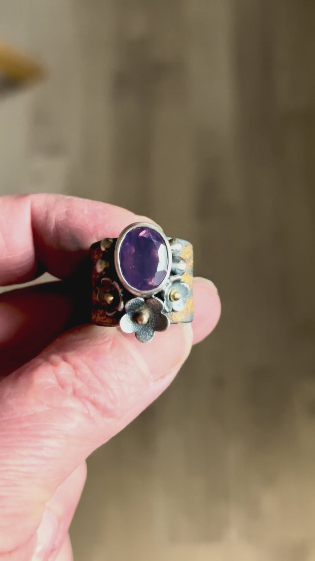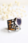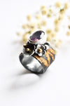 Handmade silver flowers wrap around the stone, each one finished with a tiny gold center for a subtle pop of warmth. The mix of oxidized silver, gold accents, and the calm lavender stone gives the ring an earthy, slightly wild feel while still being easy to wear every day.