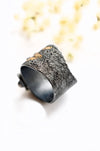 This sterling silver lavender chalcedony ring is built around soft color and strong contrast. The faceted lavender chalcedony has a gentle, dusky glow that shifts between pale violet and smoky grey depending on the light. I set it on a wide sterling silver band with a dark oxidized finish, then brushed warm streaks of gold across the surface so the highs catch the light and the lows stay rich and shadowed.