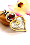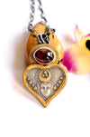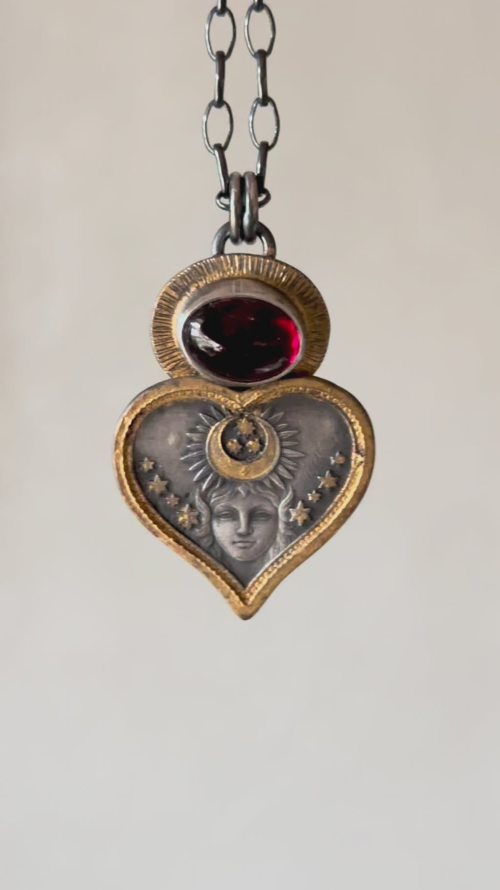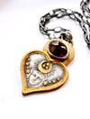 One of a kind celestial talisman necklace featuring an etched heart-shaped face crowned with a crescent moon and scattered stars, softly gilded in warm gold. A deep red rhodolite garnet cabochon glows above, bezel set like a hidden ember of passion and protection.