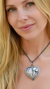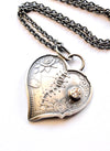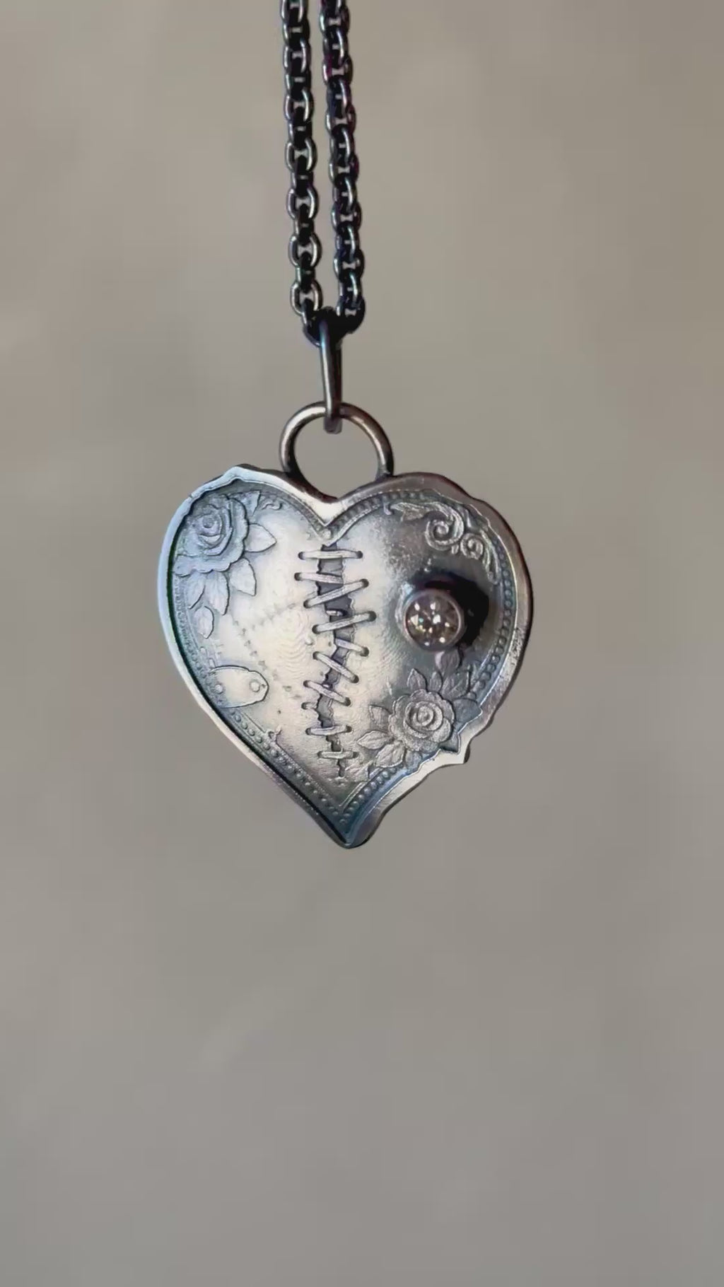 This necklace tells a story of healing, resilience, and beauty reclaimed. Shaped as a softly worn heart, the silver surface is etched with delicate roses and visible mending stitches, honoring the marks left by love, loss, and repair. Rather than hiding the fractures, they are carefully stitched together — a quiet declaration that healing leaves its own kind of beauty.