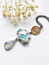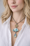 The plume agate looks like mist drifting through a turquoise sky — completely natural and entirely one of a kind. Paired with the moonstone’s luminous shimmer, this piece carries a quiet kind of magic… like wearing a sunrise and a moonbeam at once.
