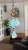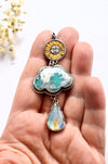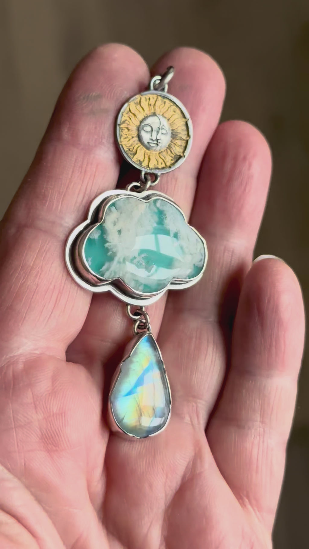 Handmade with intention, it features a gilded sun and moon charm, a dreamy plume agate doublet shaped like a soft cloud, and a glowing rainbow moonstone drop that flashes with ethereal light as it moves.