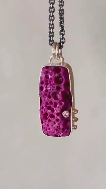 Beautiful unique ruby is bezel-set in sterling silver and accented with a small pink moissanite. The side is adorned with 18k gold ball details.