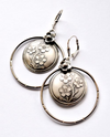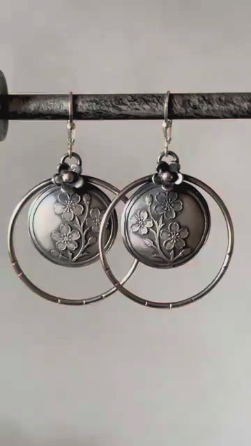 Silver discs are etched with a framed sakura blossom design and soldered against hand formed sterling silver hoops. Small silver flowers adorn the top part. Fitted with lever-back ear wires.