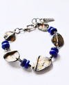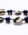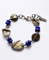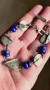 This bracelet features handmade sterling silver links shaped like weathered sand dunes, each accented with 23.5k gold specks for a warm, organic shimmer. Deep blue lapis beads are wire-wrapped between the silver pieces, adding a bold pop of color and a nice contrast to the darker patina. A simple, earthy bracelet with a lot of texture and hand-crafted character.